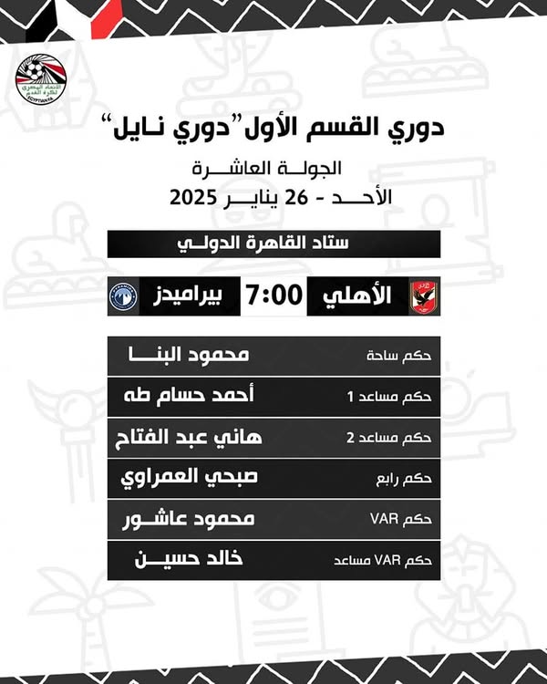 حكام مباراة الأهلي وبيراميدز في الدوري المصري الممتاز