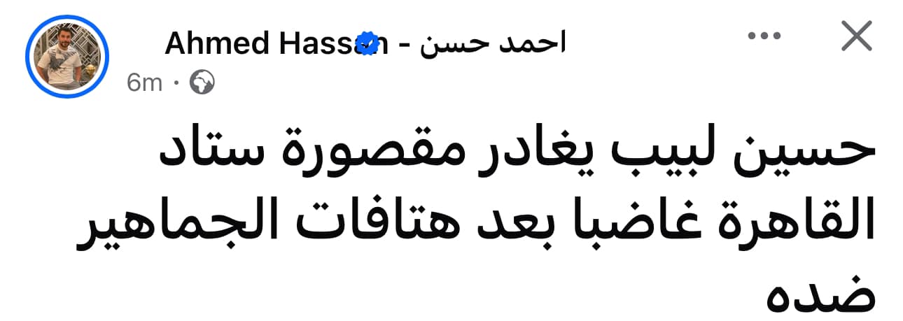وكشف الإعلامي أحمد حسن في رسالة عبر فيس بوك وقال، حسين لبيب رئيس نادي الزمالك يغادر مقصورة ستاد القاهرة قبل نهاية الشوط الأول بسبب هجوم الجماهير.