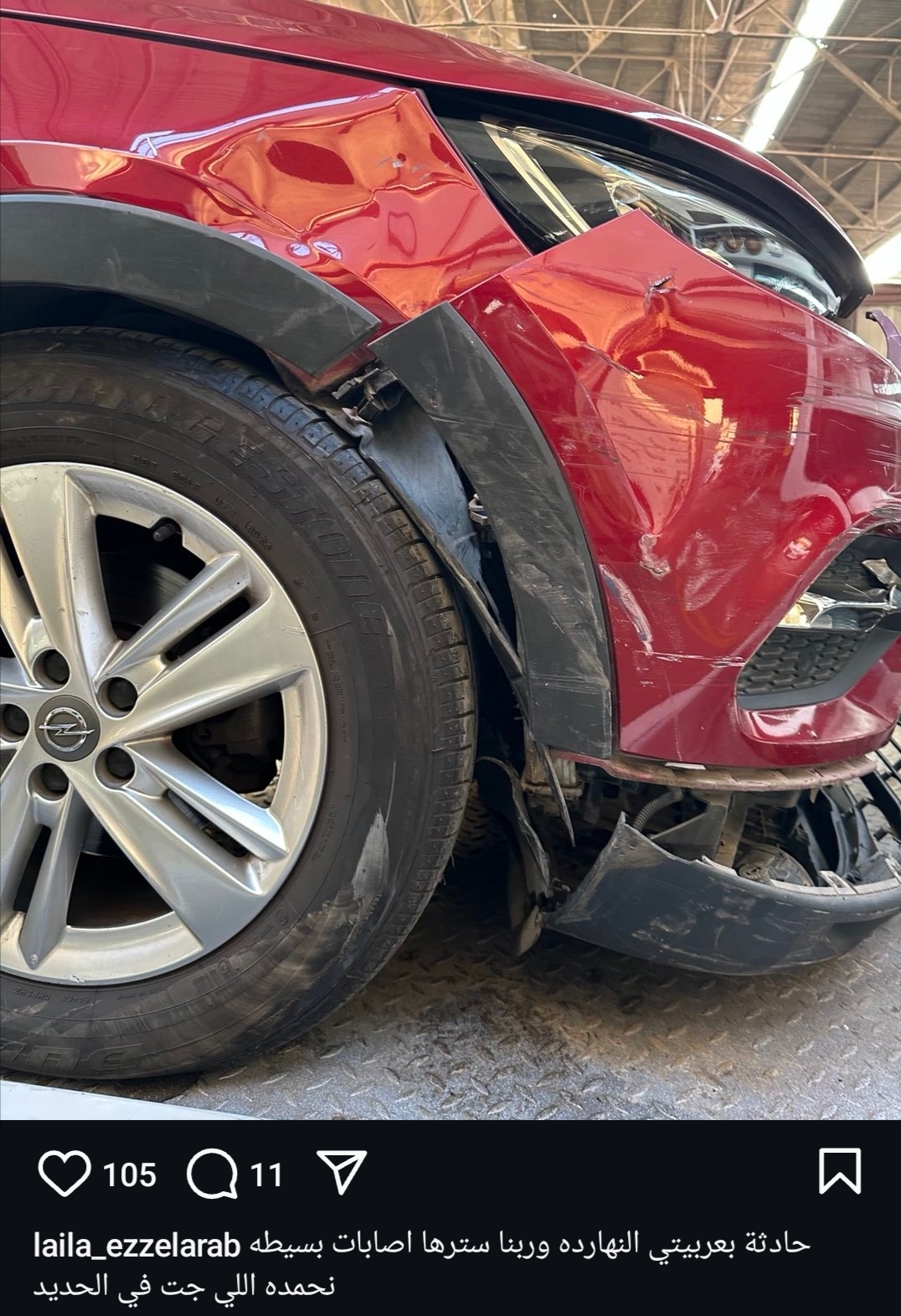 كشفت الفنانة ليلى عز العرب تعرضها إلى حادث سير أدى إلى تهشم سيارتها وتعرضها للإصابة، وأرفقت صورة السيارة عبر حسابها الرسمي على موقع تبادل الصور والفيديوهات انستجرام وعلقت عليه كاشفة عن حالتها وطمأنت الجمهور عليها قائلة وفقًا لما يرصد موقع تحيا مصر: "حادثة بعربيتي انهاردة، وربنا سترها.. إصابات بسيطة نحمده إنها جت في الحديد".