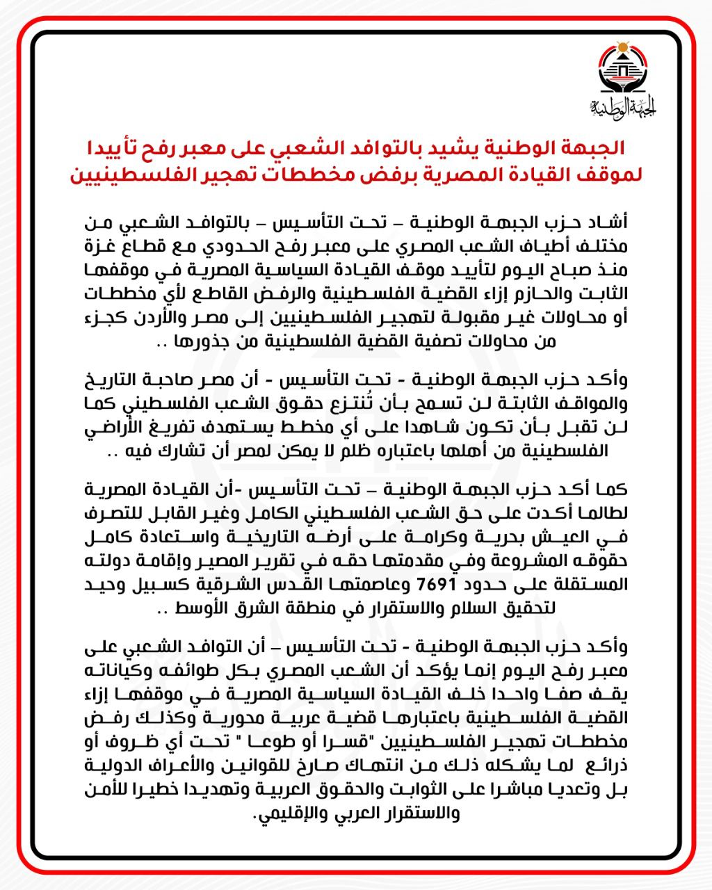 كما أكد حزب الجبهة الوطنية - تحت التأسيس - أن القيادة المصرية لطالما أكدت على حق الشعب الفلسطيني الكامل وغير القابل للتصرف في العيش بحرية وكرامة على أرضه التاريخية واستعادة كامل حقوقه المشروعة وفي مقدمتها حقه في تقرير المصير وإقامة دولته المستقلة على حدود 7691 وعاصمتها القدس الشرقية كسبيل وحيد لتحقيق السلام والاستقرار في منطقة الشرق الأوسط.