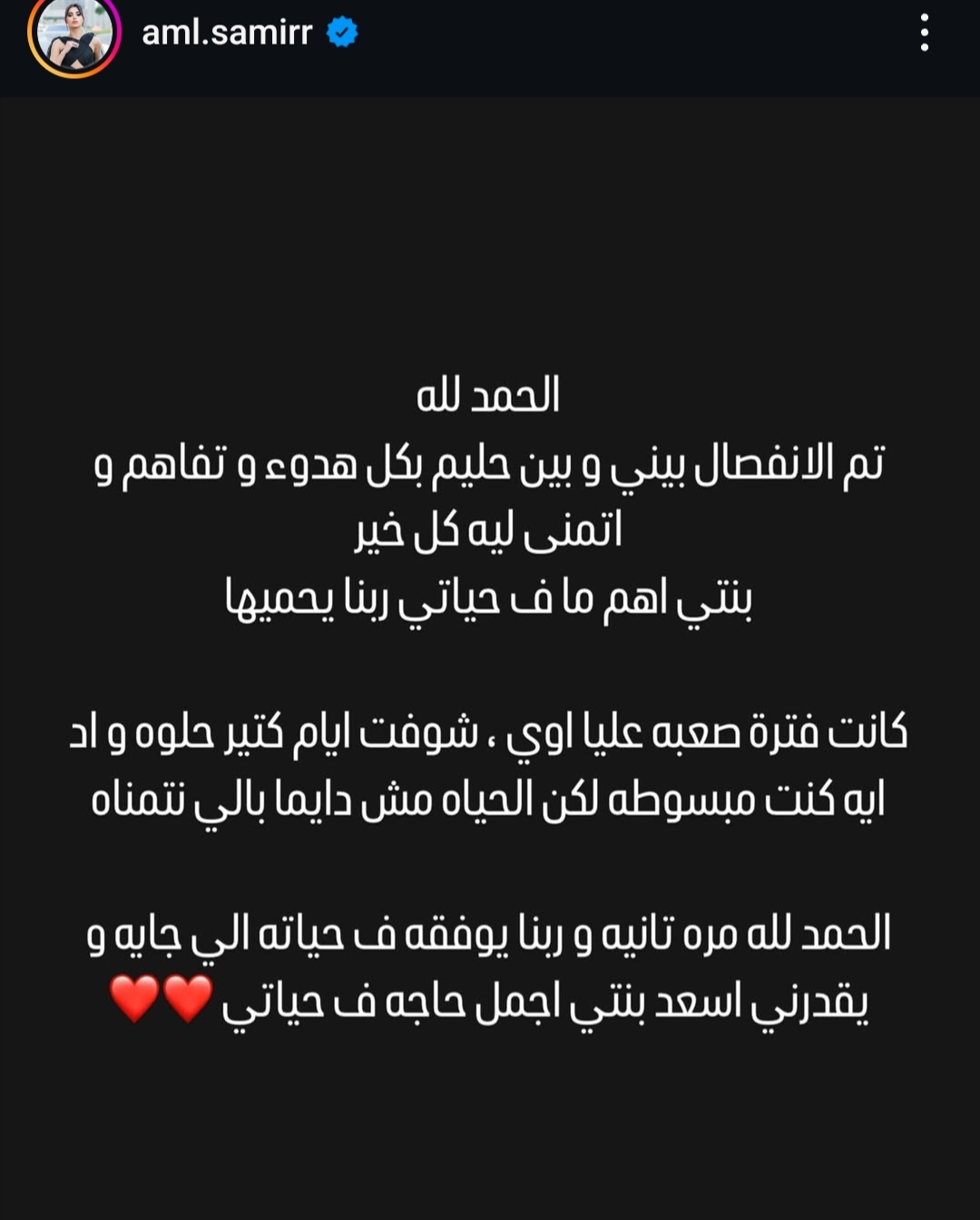 شاركت البلوجر أمل سمير منشور عبر حسابها الرسمي على موقع تبادل الصور والفيديوهات انستجرام أعلنت من خلاله طلاقها رسميًا من الفنان حليم بركات، وكتبت أمل سمير في منشورها الذي يرصده موقع تحيا مصر: "الحمد لله تم الانفصال بيني و بين حليم بكل هدوء و تفاهم و اتمنى ليه كل خير بنتي اهم ما ف حياتي ربنا يحميها، كانت فترة صعبه عليا اوي ، شوفت ايام كتير حلوه و اد ايه كنت مبسوطه لكن الحياه مش دايما بالي نتمناه.. الحمد لله مره تانيه و ربنا يوفقه ف حياته الي جايه و يقدرني اسعد بنتي اجمل حاجه في حياتي"، وانهالت التعليقات على منشور البلوجر أمل سمير ووجهوا الدعوات لها ولزوجها بالعودة إلى بعضهما مرة أخرى حيث يحظون بحب واهتمام قاعدة جماهيرية كبيرة.