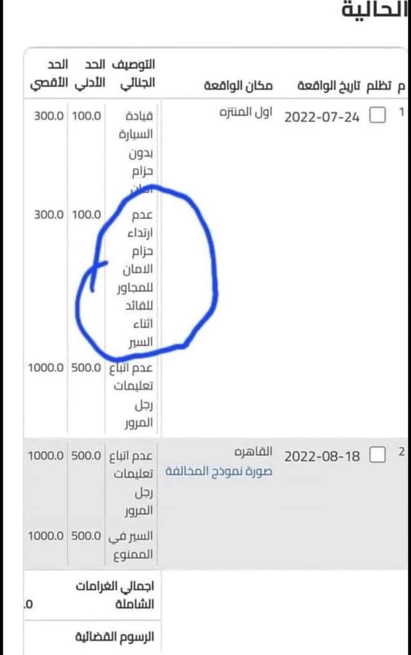 يتم توقيع غرامة على عدم ارتداء سائق السيارة أو الشخص المجاور له، الحد الأدنى لها 100 جنيه، والأقصى 300 جنيه.