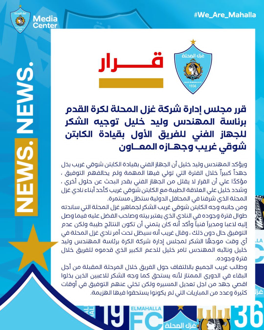 أعلن نادي غزل المحلة، توجيه الشكر للجهاز الفني للفريق الكروي الأول بقيادة الكابتن شوقي غريب بسبب سوء النتائج خلال الفترة الأخيرة.