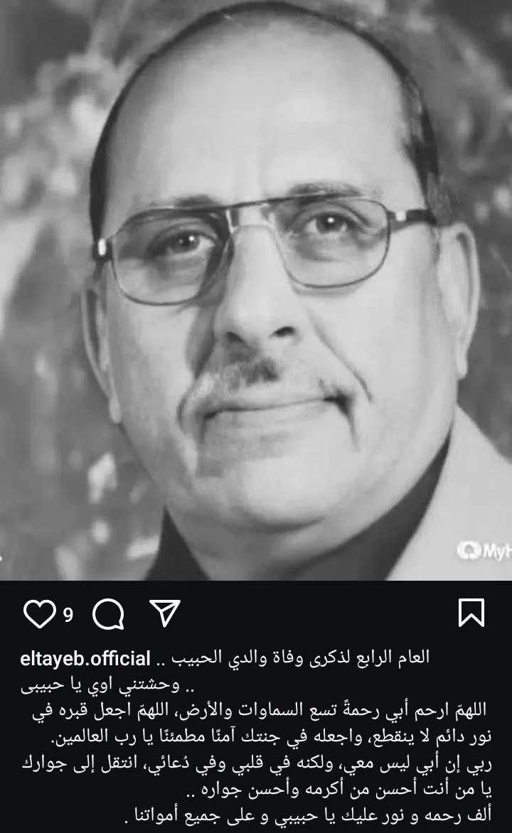 وشارك علي الطيب صورة لوالده عبر حسابه الرسمي بموقع تبادل الصور والفيديوهات انستجرام في منشور رصده موقع تحيا مصر، وعلق عليه، قائلا: العام الرابع لذكرى وفاة والدي الحبيب .. وحشتني اوي يا حبيبى .. اللهمّ ارحم أبي رحمةً تسع السماوات والأرض، اللهمّ اجعل قبره في نور دائم لا ينقطع، واجعله في جنتك آمنًا مطمئنًا يا رب العالمين، ربي إن أبي ليس معي، ولكنه في قلبي وفي دُعائي، انتقل إلى جوارك يا من أنت أحسن من أكرمه وأحسن جواره ..ألف رحمه و نور عليك يا حبيبي و على جميع أمواتنا.