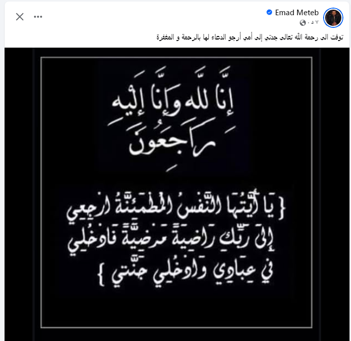 أعلن عماد متعب لاعب النادي الأهلي ومنتخب مصر السابق، على حساب التواصل الاجتماعي الخاص به على فيس بوك، وفاة جدته في الساعات الماضية.
