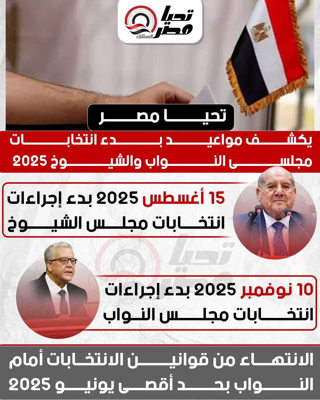 وفى ضوء نصوص الدستور قوانين مجلسى النواب والشيوخ فبدء إجراءات الانتخابات للمجالس الجديد يكون قبل نهاية الفصل التشريعى بـ 60 يومًا ومن ثم يكون بدء الإجراءات لمجلس الشيوخ في 15 أغسطس 2025 ولمجلس النواب في نحو 10 نوفمبر 2025 .