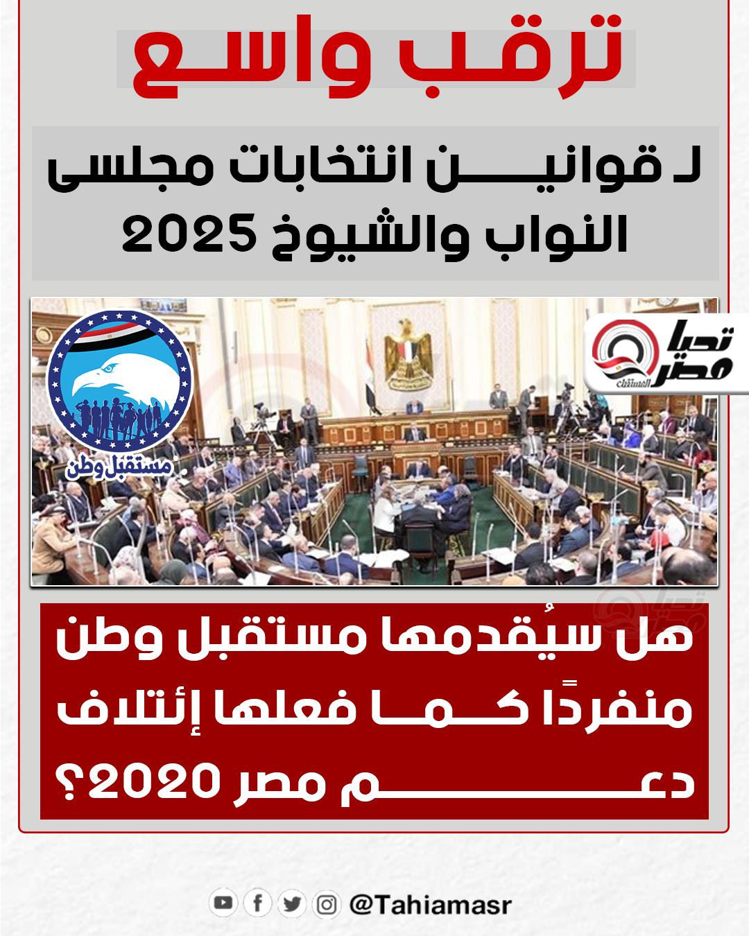 على مستوى التشريعات المنظمة سنكون أمام ترجيحات بأن تتقدم الأغلبية البرلمانية بالتعديلات على قوانين مجلسى النواب والشيوخ ومباشرة الحقوق السياسية وتقسيم الدوائر على أن يتم الانتهاء منها بحد أقصى شهر يونيو 2025.