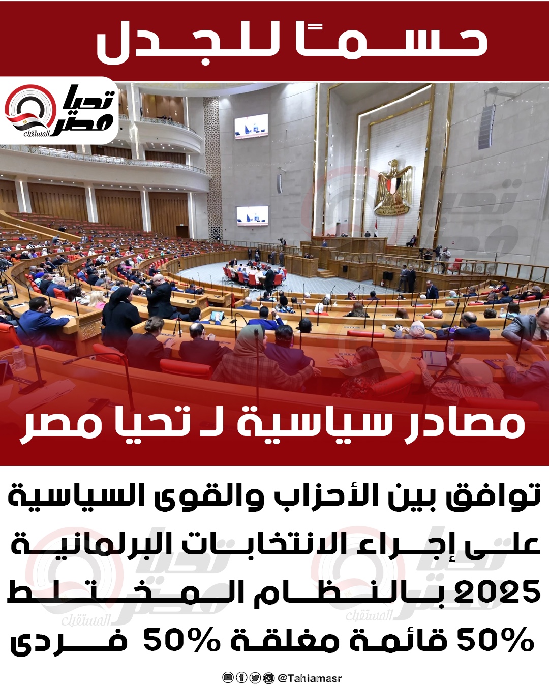 - توافق بين الأحزاب والقوى السياسية على إجراء الانتخابات البرلمانية بنظام القائمة الم طلقة ٥٠٪ والفردى٥٠٪