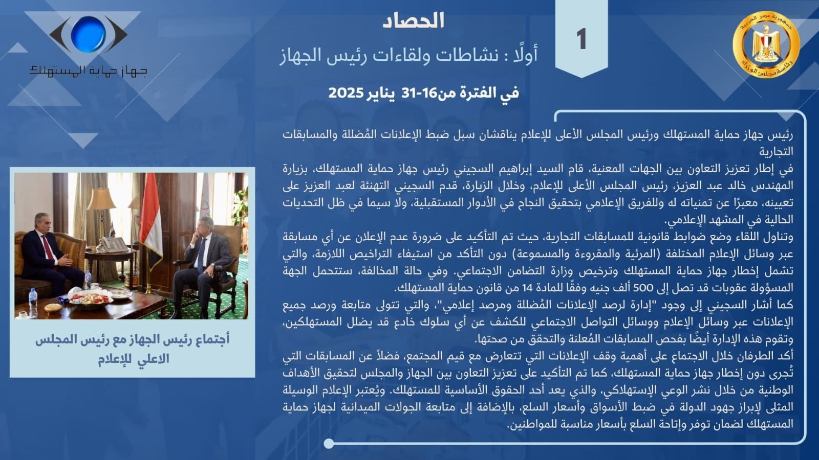 عقد ابراهيم السجيني، رئيس جهاز حماية المستهلك، لقاءًا مع معالي الوزير المهندس / خالد عبد العزيز ، رئيس المجلي الأعلي لتنظيم الإعلام لبحث ضوابط الإعلانات المُضللة والخادعة والوقف الفوري لها، والمسابقات التجارية بمختلف وسائل الإعلام، وكذا الملفات ذات الإهتمام المشترك بين الجانبين.