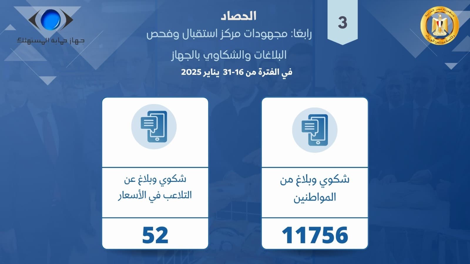 تلقي مركز استقبال وفحص البلاغات والشكاوي بالجهاز، عدد (11756)شكوي وبلاغ من المواطنين خلال النصف الثاني من يناير الماضي ، عبر الطرق المختلفة للورود، وعقب الانتهاء من أعمال المراجعة والفحص المبدئي للشكاوى والطلبات تم تحويلها للإدارات المعنية بالجهاز للتحقيق فيها ، وتم إزالة أسباب النصيب الأكبر من الشكاوي وفقاً لطبيعة كل شكوي ، كما تلقي في ذات الفترة عدد (52)بلاغ وشكوي عن التلاعب في الأسعار والبيع بأزيد من السعر المُعلن بعدة مناطق مختلفة،وعلي الفورتم إحالة هذه الشكاوي للإدارات المعنية، والتي بدورها قامت علي الفور بتوجيه حملات رقابية علي المناطق الوارد منها البلاغات وإتخاذ الإجراءات القانونية حيال المخالفين ، وإزالة أسباب البلاغات الواردة وإبلاغ الشاكيين بما تم من إجراءات .