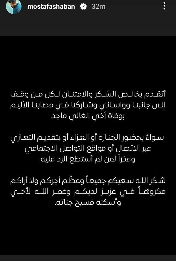 وكتب مصطفى شعبان في منشور رصده موقع تحيا مصر عبر حسابه الرسمي بموقع تبادل الصور والفيديوهات انستجرام: اتقدم بخالص الشكر والامتنان لكل من وقف إلى جانبنا وواسني في مصابنا الأليم بوفاة أخي الغالي ماجد، سواء بحضور الجنازة أو العزاء أو تقديم التعازي عبر الاتصال او مواقع التواصل الاجتماعي وعذار لمن لا استطع الرد عليه.