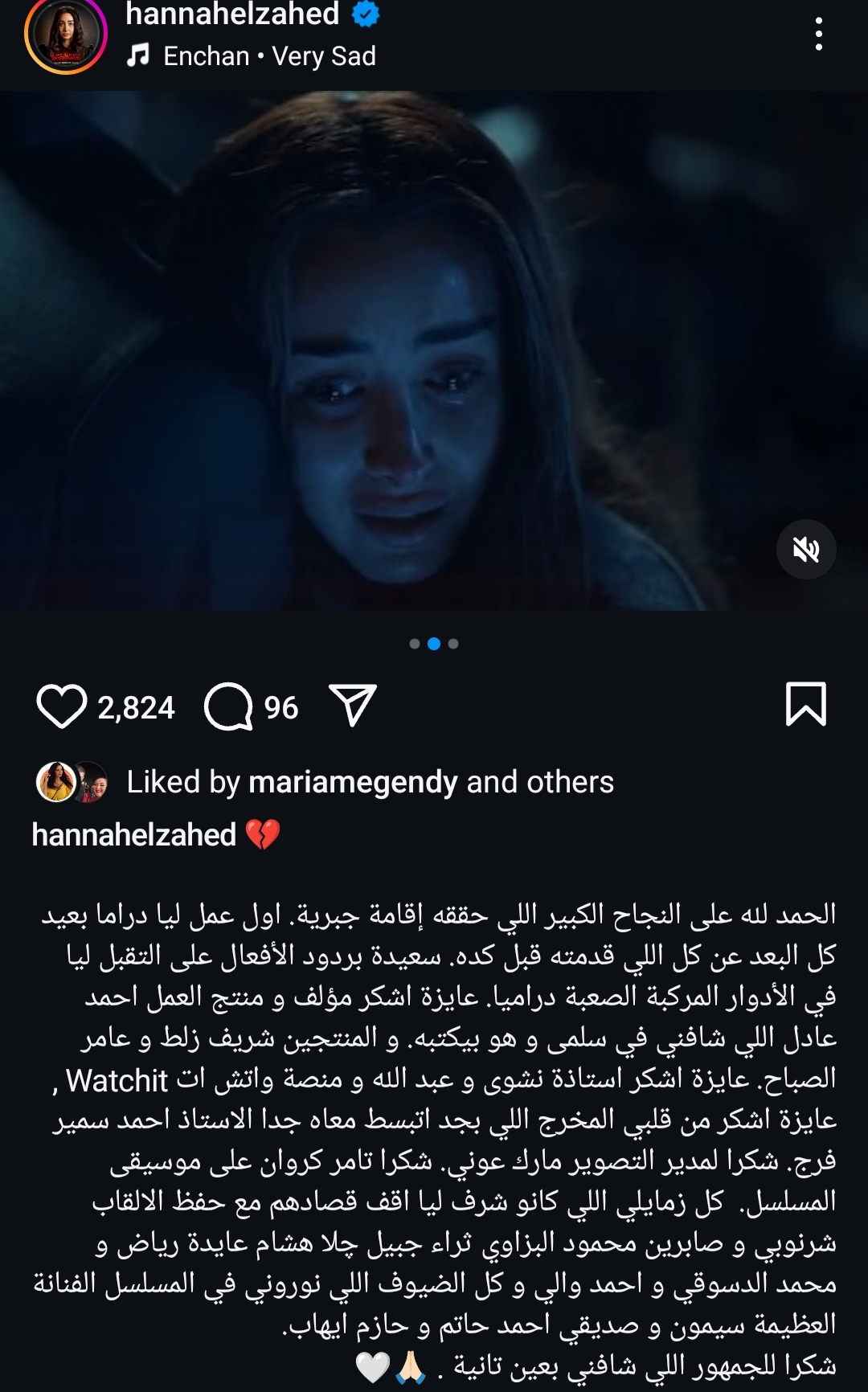 وتابعت هنا: “شكرا لمدير التصوير مارك عوني شكرا تامر كروان على موسيقى المسلسل كل زمايلي اللي كانوا شرف ليا اقف قصادهم مع حفظ الالقاب شرنوبي و صابرين محمود البزاوي ثراء جبيل چلا هشام عايدة رياض و محمد الدسوقي و احمد والي و كل الضيوف اللي نوروني في المسلسل الفنانة العظيمة سيمون و صديقي احمد حاتم و حازم ايهاب شكرا للجمهور اللي شافني بعين تانية”.
