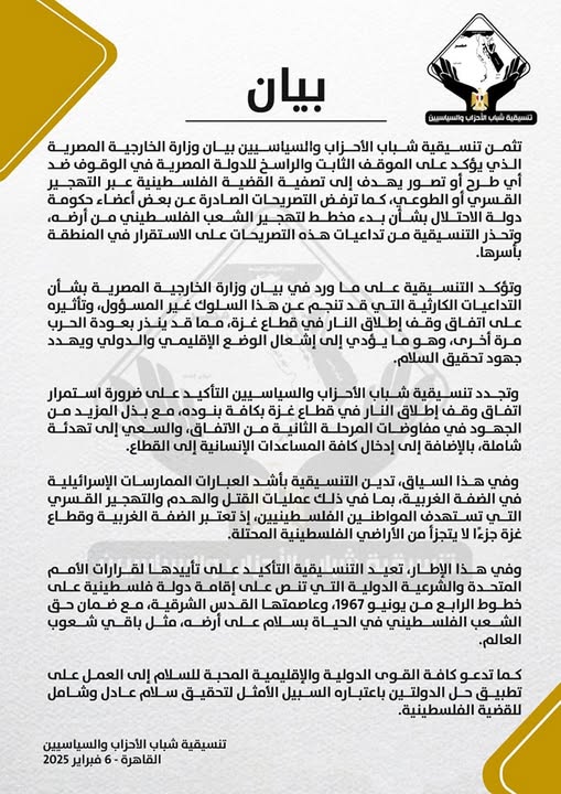 تثمن تنسيقية شباب الأحزاب والسياسيين، بيان وزارة الخارجية المصرية الذي يؤكد على الموقف الثابت والراسخ للدولة المصرية في الوقوف ضد أي طرح أو تصور يهدف إلى تصفية القضية الفلسطينية عبر التهجير القسري أو الطوعي، كما ترفض التصريحات الصادرة عن بعض أعضاء حكومة دولة الاحتلال بشأن بدء مخطط لتهجير الشعب الفلسطيني من أرضه، وتحذر التنسيقية من تداعيات هذه التصريحات على الاستقرار في المنطقة بأسرها.