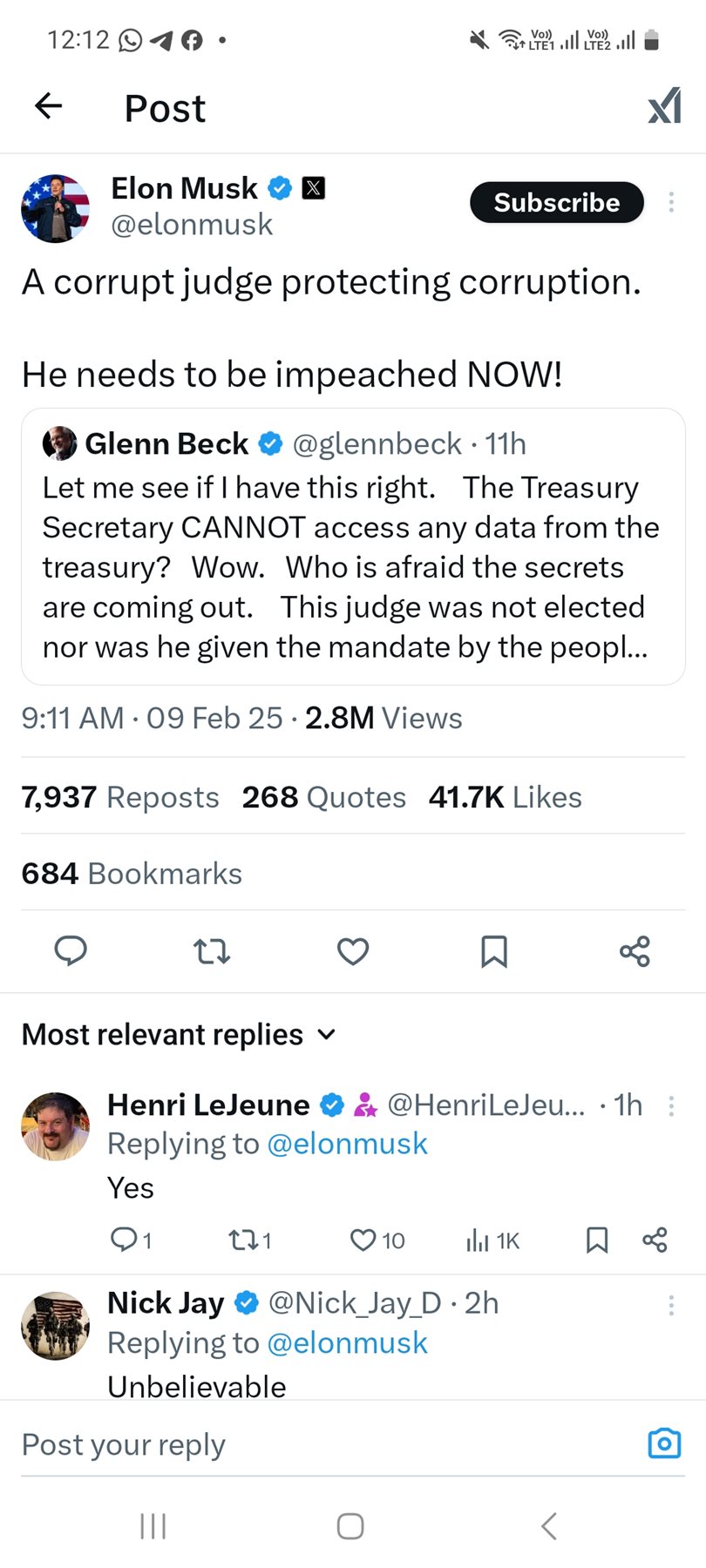 وفي منشور على منصة "إكس"، اتهم ماسك القاضي بـ "حماية الفساد"، مطالبًا بعزله فورًا.