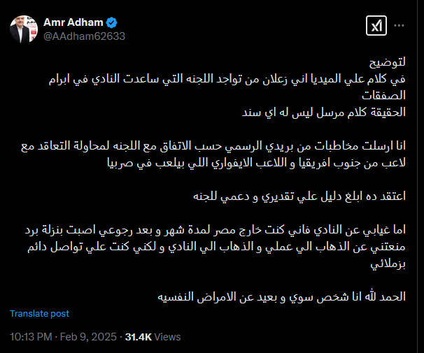 واضاف عمرو أدهم في تصريحاته عبر "إكس"، في كلام علي الميديا اني زعلان من تواجد اللجنة التي ساعدت النادي في ابرام الصفقات وفي الحقيقة كلام مرسل ليس له أي سند.
