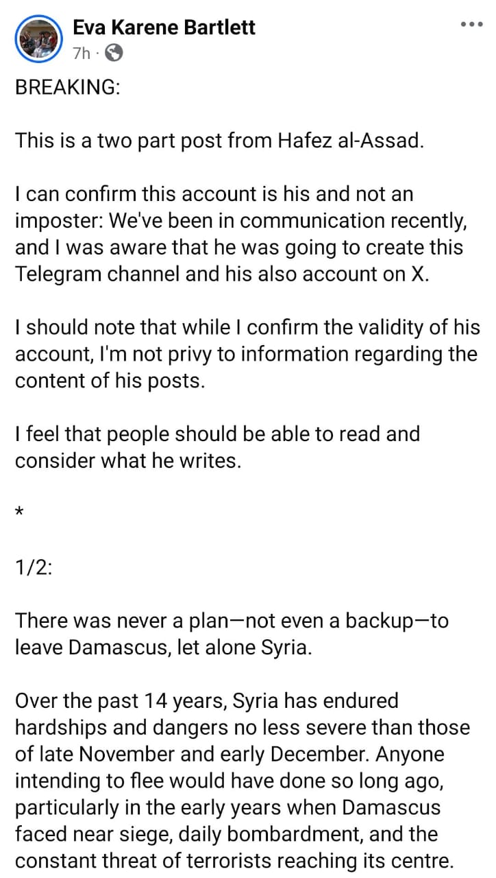 تناول الحساب أيضاً اللحظات الأخيرة التي تلت تدهور الأوضاع في سوريا في ديسمبر 2012، مشيراً إلى أن الإشاعات حول هروب الأسرة الحاكمة انتشرت بشكل واسع، لكن حافظ الأسد نفى ذلك مؤكداً وجوده في دمشق.