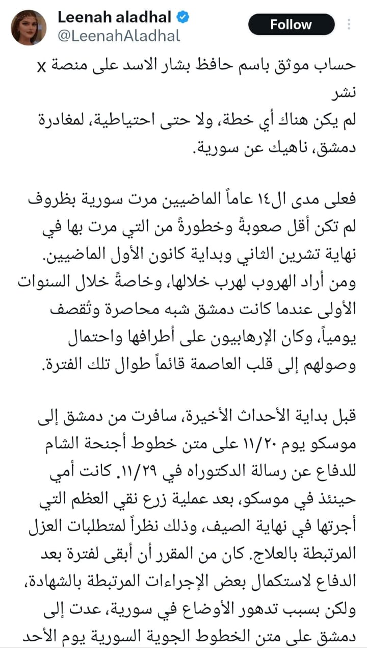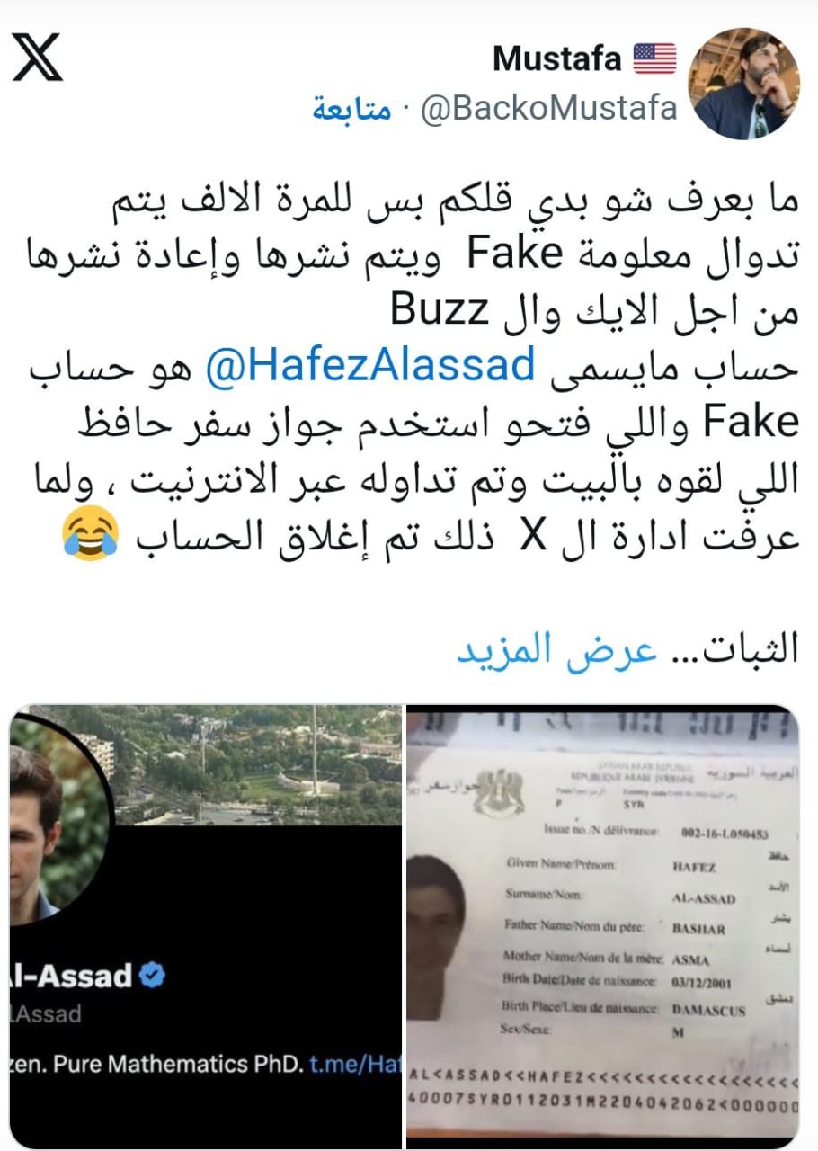 الحساب الذي تم حذفه سريعاً من منصة "إكس" عقب نشره، أثار تساؤلات حول مصداقيته، رغم تأكيد صحفية أميركية موالية للأسد على صحته.