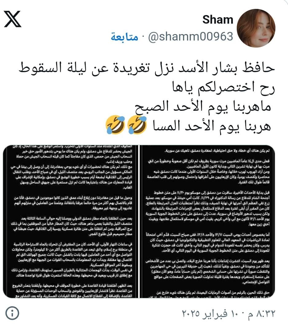 شهدت منصات التواصل الاجتماعي جدلاً واسعاً بعد نشر حساب موثق يحمل اسم "حافظ الأسد"، نجل الرئيس السوري السابق بشار الأسد، تفاصيل مثيرة عن اللحظات الأخيرة قبل سقوط النظام السوري في عام 2012.