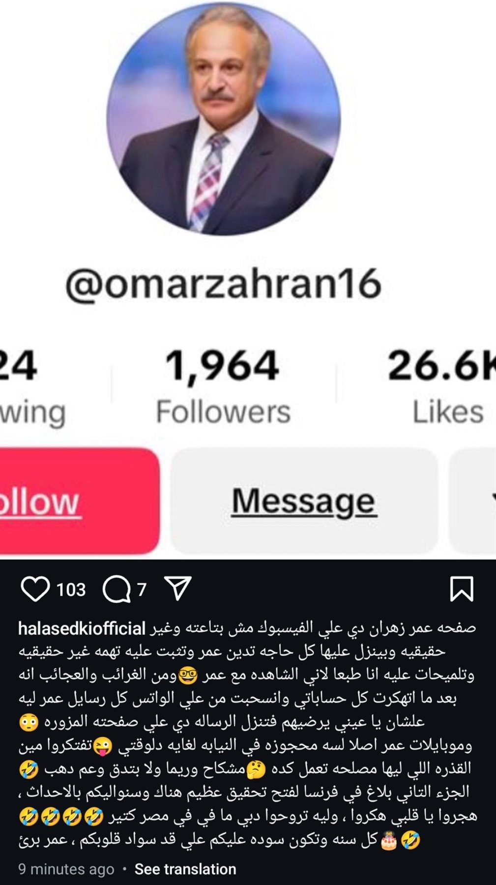 وتابعت هالة صدقي حديثها مؤكدة أن هذه الحسابات مزيفة، وأن عمر زهران ما زالت هواتفه في النيابة تحتجزها منذ إلقاء القبض عليه وحكم حبسه، وقالت وفقًا لما يرصده موقع تحيا مصر: "وموبايلات عمر اصلا لسه محجوزه في النيابه لغايه دلوقتي تفتكروا مين القذره اللي ليها مصلحة تعمل كده.. هعمل بلاغ في فرنسا لفتح تحقيق عظيم هناك وسنواليكم بالاحداث ، هجروا يا قلبي هكروا ، وليه تروحوا دبي ما في في مصر كتير . كل سنه وتكون سوده عليكم علي قد سواد قلوبكم ، عمر برئ".