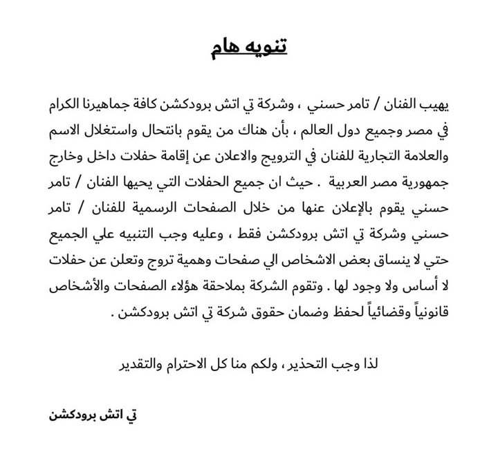 وتابع تامر حسني حديثه، قائلا: جميع الحفلات التي يحييها تامر حسني يقوم بالإعلان عنها من خلال الصفحة الرسمية للفنان وشركته، وعليه وجب التنبيه على الجميع، حتى لا ينساق بعض الأشخاص إلى صفحات وهمية تروج وتعلن عن حفلات لا أساس ولا وجود لها، وتقوم الشركة بملاحقة هؤلاء الصفحات والأشخاص قانونياً وقضائياً لحفظ وضمان حقوق شركته لذا وجب التحذير ، ولكم منا كل الاحترام والتقدير.