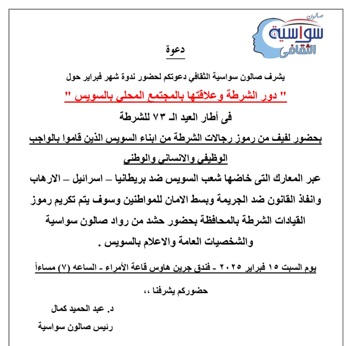 ينظم صالون سواسية الثقافي ندوة تحت عنوان "دور الشرطة وعلاقتها بالمجتمع المحلى بالسويس"، وذلك في إطار العيد الـ ٧٣ للشرطة.
