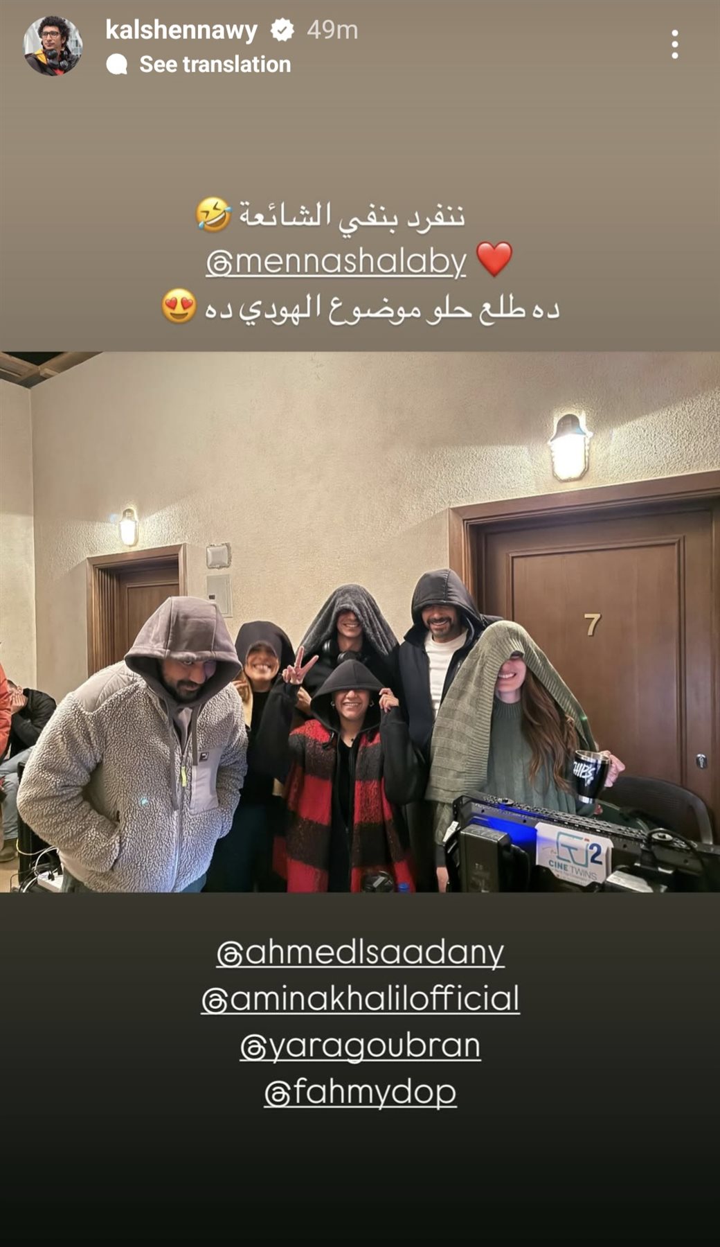 ونشر كريم الشناوي في منشوره الذي يرصده موقع تحيا مصر صورة من كواليس مسلسل لام شمسية، وظهر فيها رفقة أحمد السعدني وأمينة خليل، ومجموعة من فريق العمل وهم يخفون وجوههم بغطاء الرأس، وعلق الشناوي على الصورة وكتب: "ننفرد بنفي الشائعة.. دا طلع حلو موضوع الهودي دا"، وأشار كريم الشناوي في منشوره إلى منة شلبي.