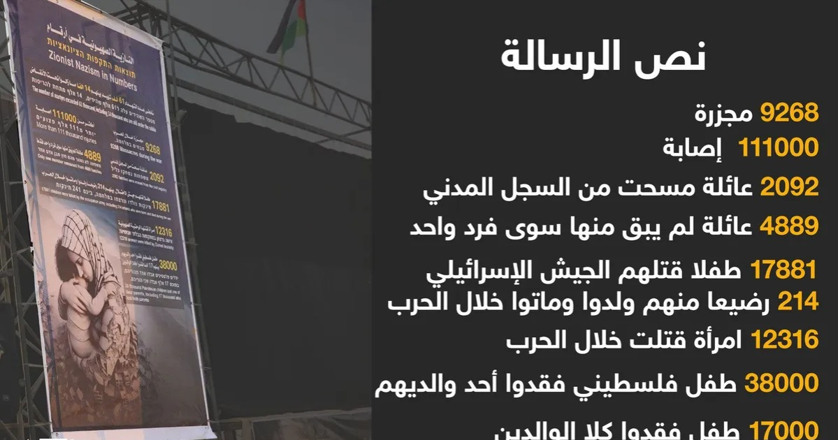 لافتة ضخمة في المكان، أظهرت فلسطينيًا يقف متجذرًا في الأرض في مواجهة دبابات الاحتلال، بينما حملت العبارة "عودة الحرب يساوي عودة الأسرى في توابيت"، في إشارة إلى تهديد صريح من حركة حماس بأن العودة إلى الحرب ستكون محفوفة بالمخاطر على الجميع.