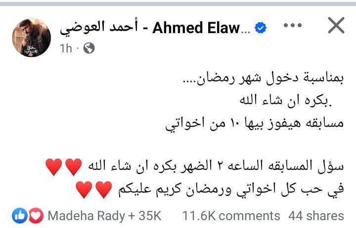 وكتب أحمد العوضي في منشور عبر حسابه الرسمي بموقع التواصل الاجتماعي فيسبوك ورصده موقع تحيا مصر: بمناسبة دخول شهر رمضان.. بكرة إن شاء الله مسابقه هيفوز بيها ١٠ من اخواتي.. سؤل المسابقه الساعه ٢ الضهر بكره ان شاء الله، في حب كل اخواتي ورمضان كريم عليكم.