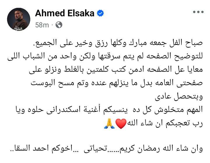 وقال أحمد السقا في تصريحات رصدها موقع تحيا مصر عبر حسابه الرسمي بموقع التواصل الاجتماعي فيسبوك: صباح الفل جمعة مبارك وكلها رزق وخير على الجميع، للتوضيح الصفحه لم يتم سرقتها ولكن واحد من الشباب اللى معايا عل الصفحه ادمين كتب كلمتين بالغلط ونزلو على صفحتى العامه بدل ما ينزلهم عندو وتم مسح البوست وبتحصل عادى.