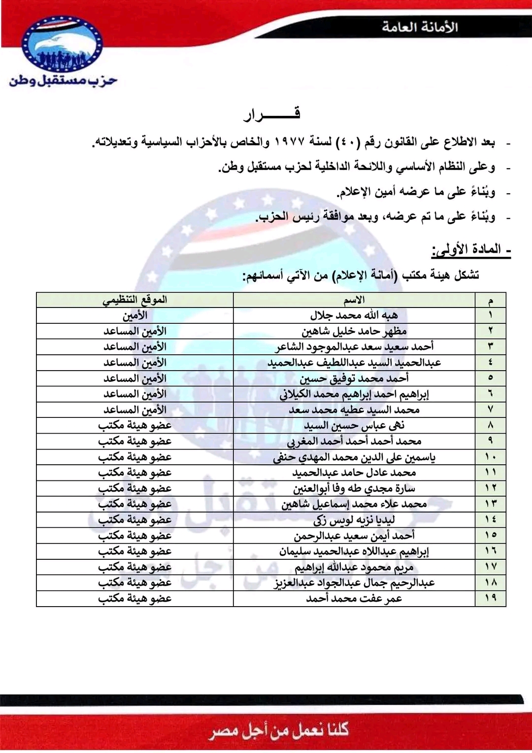 وجاء التشكيل الجديد بعد الاطلاع على القانون رقم (40) لسنة 1977 الخاص بالأحزاب السياسية، والنظام الأساسي واللائحة الداخلية للحزب، وبناءً على ما عرضه أمين الإعلام وموافقة رئيس الحزب.