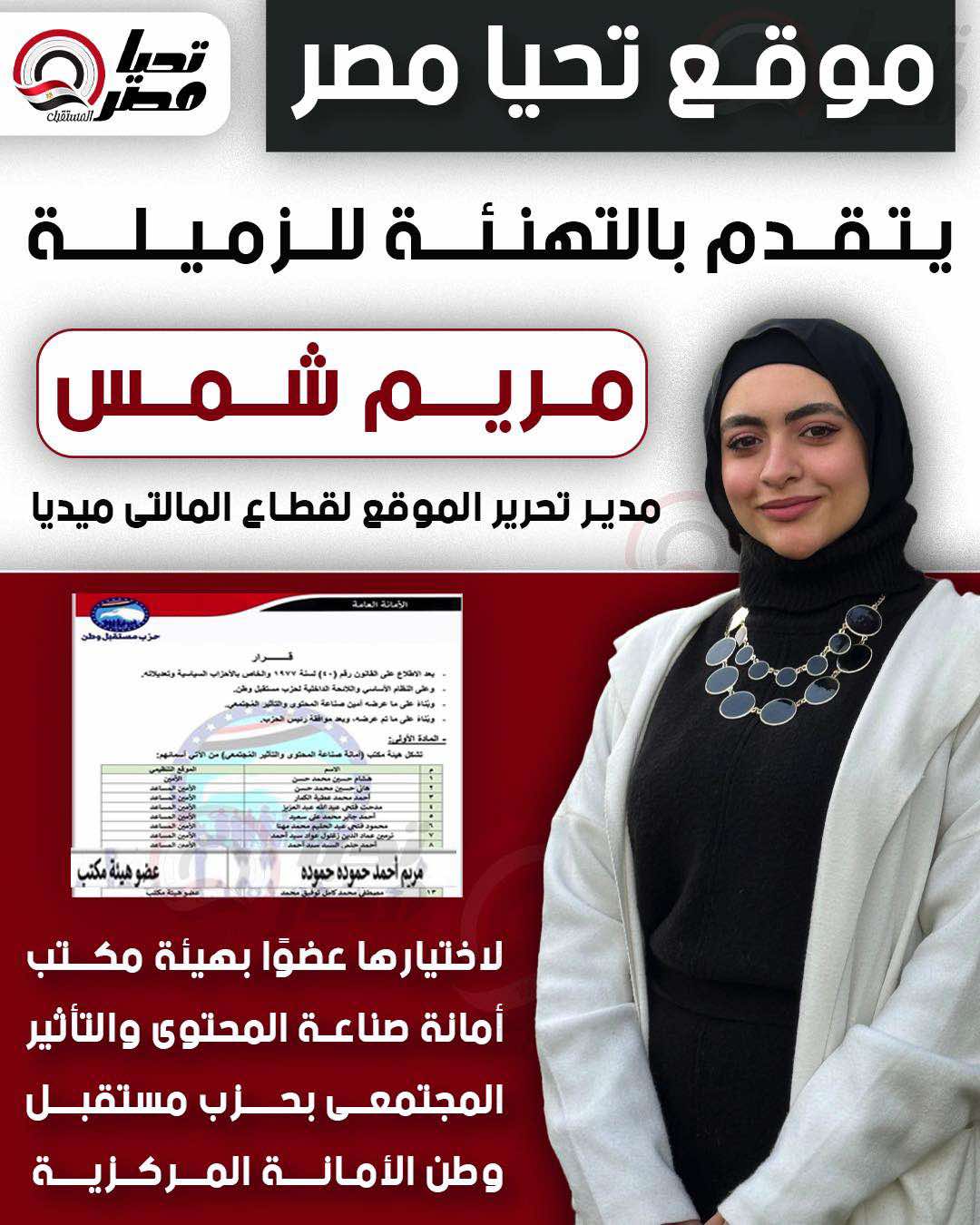 تحيا مصر يهنئ الزميلة مريم شمس بالانضمام إلى أمانة صناعة المحتوى والتأثير المجتمعي بمستقبل وطن