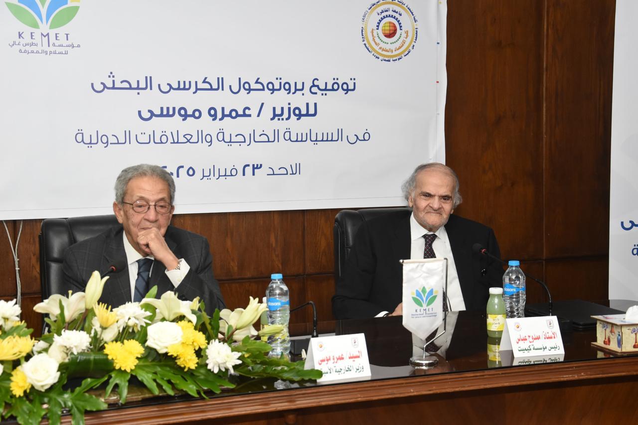 وقعت مؤسسة "كيميت بطرس غالي للسلام والمعرفة" و كلية الاقتصاد والعلوم السياسية بجامعة القاهرة، اليوم الأحد، بروتوكول تدشين كرسي بحثي يحمل اسم "عمرو موسى" الأمين العام السابق لجامعة الدول العربية و وزير خارجية مصر الأسبق، وذلك في السياسة الخارجية و العلاقات الدولية؛ إسهاماً في دعم ملف البحث العلمي بمصر.