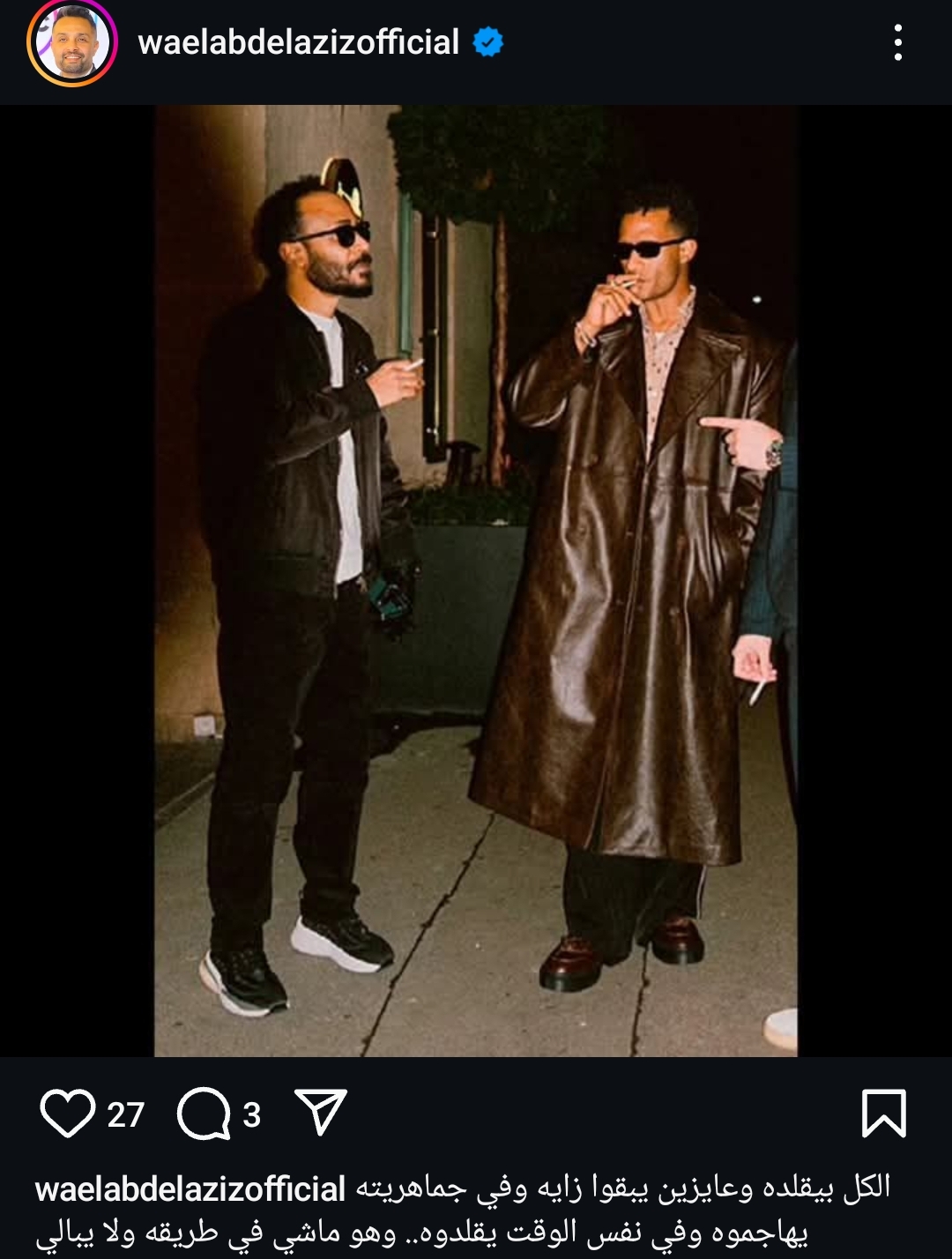 ونشر وائل عبد العزيز صورة لـ محمد رمضان عبر حسابه الرسمي على موقع تبادل الصور والفيديوهات انستجرام يرصدها موقع تحيا مصر وعلق عليها موجهًا رسالة إلى منتقدي محمد رمضان وقال: "الكل بيقلده وعايزين يبقوا زيه وفي جماهريته وبيهاجموه في نفس الوقت وهو ماشي في طريقه ولا يبالي"، وعلق عدد كبير من متابعي وائل عبد العزيز على منشوره مؤكدين على صحة حديثه ومنهم من دعم محمد رمضان وعبر عن حبه له، ومنهم من هاجمه واستنكر حديث وائل عبد العزيز.