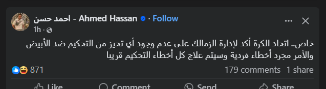 تحيا مصر، وكتب أحمد حسن عبر حسابه الرسمي"فيس بوك":" اتحاد الكرة أكد لإدارة الزمالك على عدم وجود أي تحيز من التحكيم ضد الأبيض والأمر مجرد أخطاء فردية وسيتم علاج كل أخطاء التحكيم قريباً".