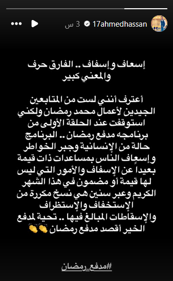 وكتب أحمد حسن في رسالة عبر ستوري إنستجرام، أعترف أنني لست من المتابعين الجيدين لأعمال محمد رمضان ولكني استوقفت عند الحلقة الأولى من برنامج ندفع رمضان والبرنامج حالة من الإنسانية وجبر الخواطر.