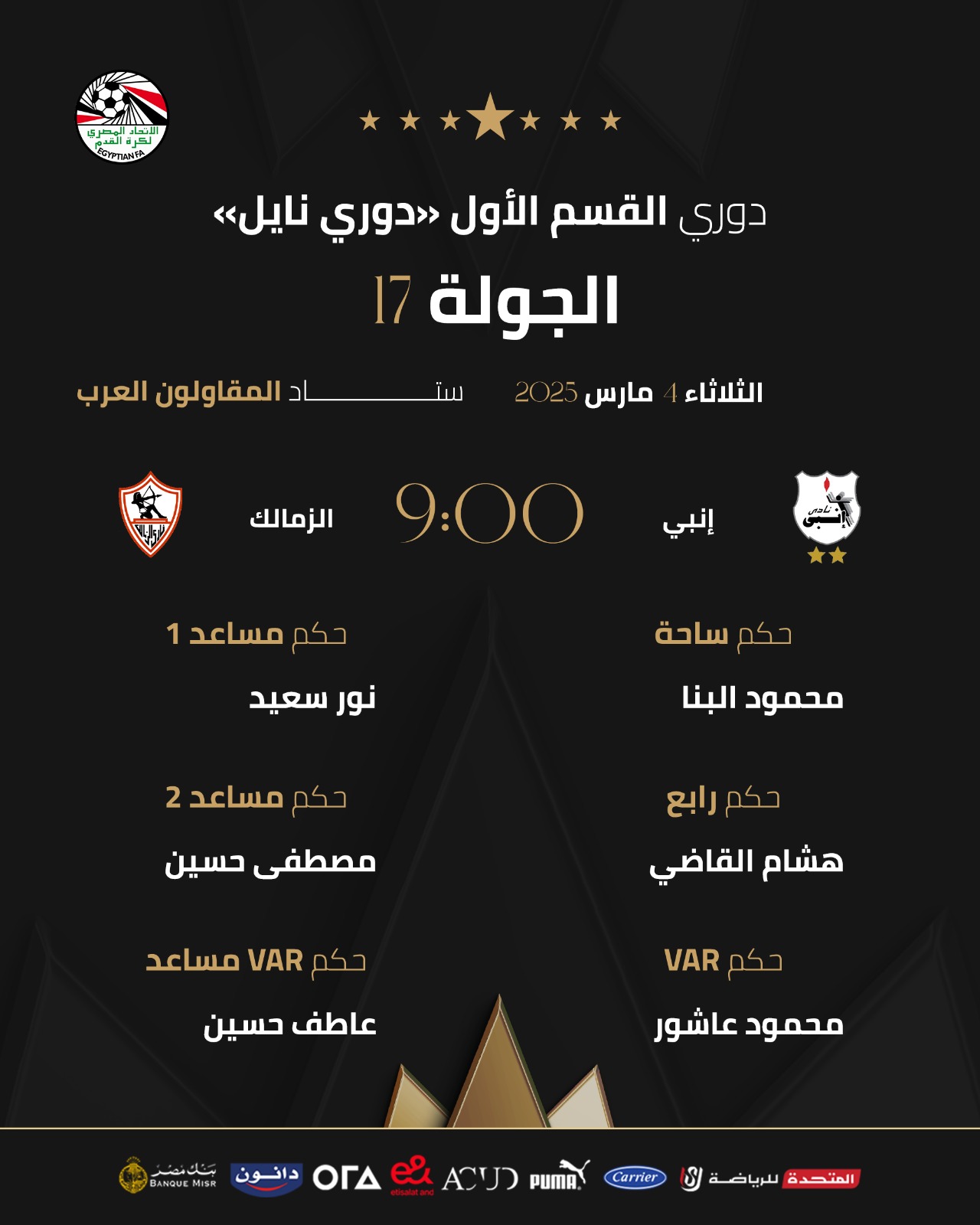 حكام مباراة الزمالك وإنبي في الدوري الممتاز