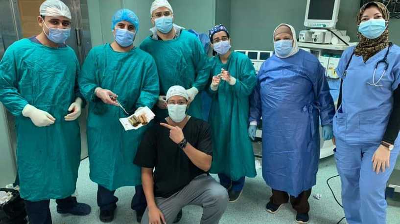 وكان المريض البالغ من العمر 60 عاماً قد حضر إلى مستشفيات جامعة المنوفية، يعاني من ارتفاع متكرر في درجه الحرارة، وعدم القدرة على تناول الطعام، وبعمل الفحوصات اللازمة تبين وجود جسم غريب بحجم 15 سم × 15 سم، في المنطقة التي تم استئصال الكلى اليمنى منها منذ 7 سنوات.