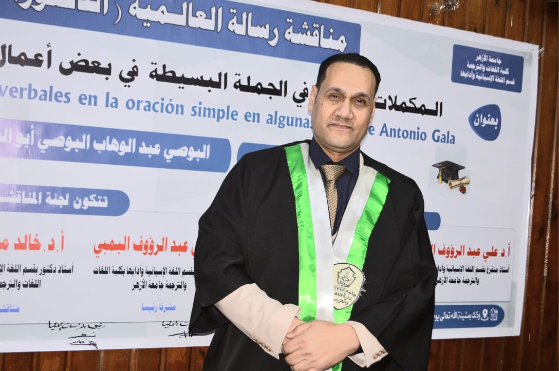 ناقش قسم اللغة الإسبانية وأدابها، بكلية اللغات والترجمة بجامعة الأزهر الشريف، رسالة الدكتوراة المقدمة من الباحث، البوصي عبد الوهاب أبو العينين، وذلك تحت عنوان "المكملات الفعلية في الجملة البسيطة في بعض أعمال أنطونيو جالا".
