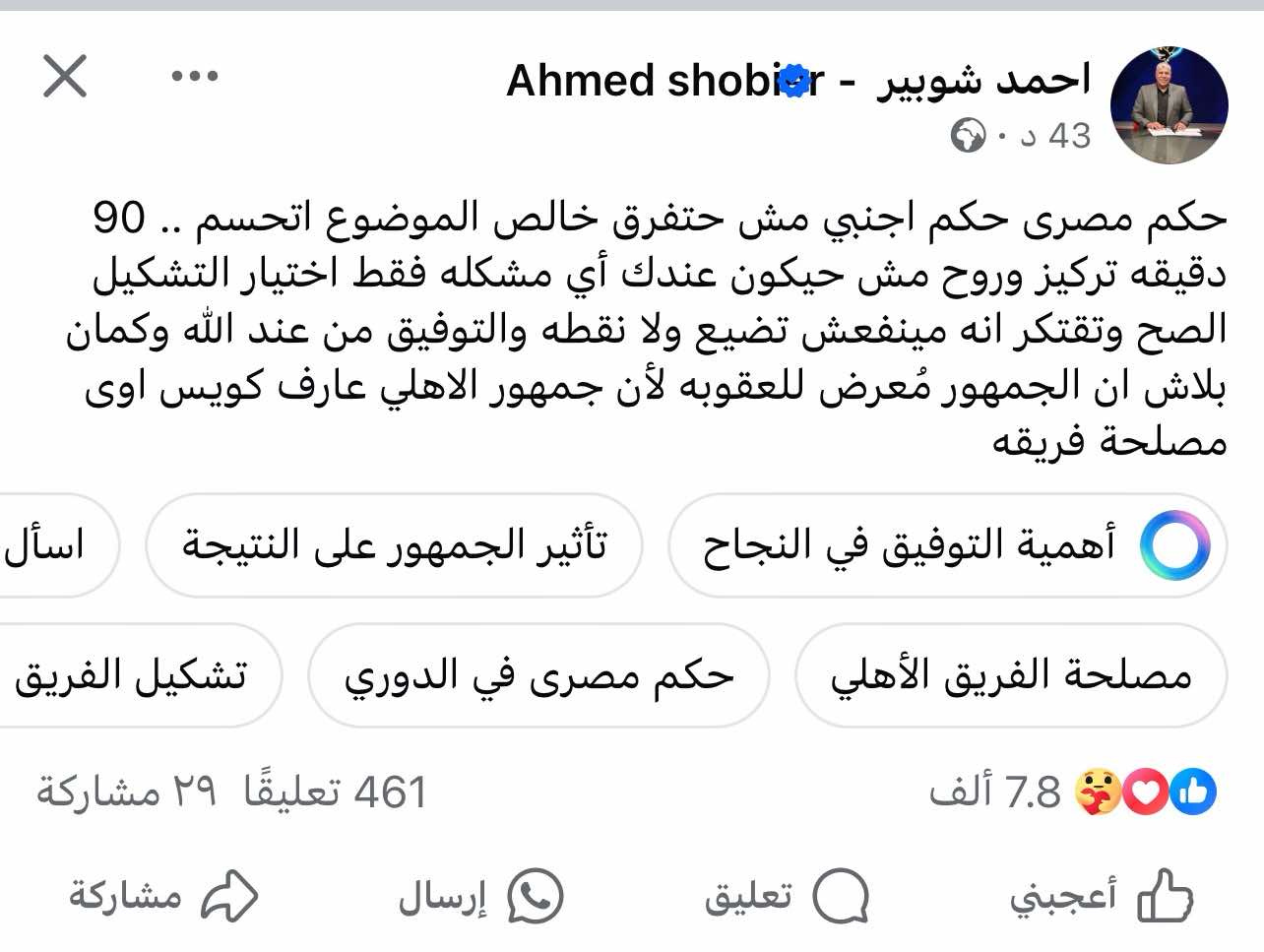 وكتب أحمد شوبير في رسالة عبر فيسبوك، حكم مصري حكم أجنبي مش هتفرق خالص الموضوع إتحسم.