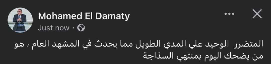 وكتب محمد الدماطي في رسالة عبر فيسبوك، المتضرر الوحيد على المدى الطويل مما يحدث في المشهد العام هو من يضحك اليوم بمنتهى الذاجة.