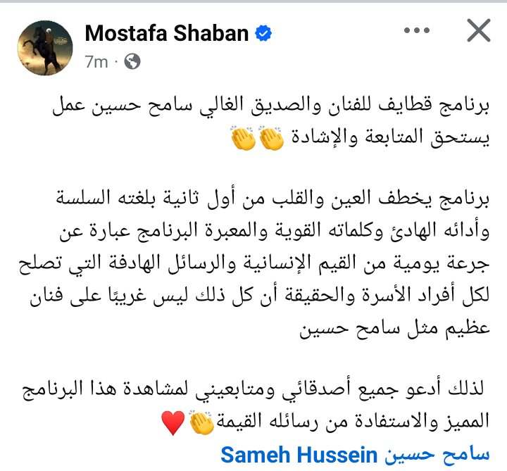 وكتب مصطفى شعبان في منشور رصده موقع تحيا مصر عبر حسابه الرسمي بموقع التواصل الاجتماعي فيسبوك: برنامج قطايف للفنان والصديق الغالي سامح حسين عمل يستحق المتابعة والإشادة، برنامج يخطف العين والقلب من أول ثانية بلغته السلسة وأدائه الهادئ وكلماته القوية والمعبرة، البرنامج عبارة عن جرعة يومية من القيم الإنسانية والرسائل الهادفة التي تصلح لكل أفراد الأسرة، الحقيقة أن كل ذلك ليس غريبًا على فنان عظيم مثل سامح حسين.