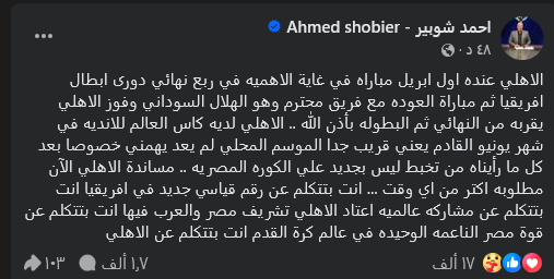 وأضاف أحمد شوبير في رسالته على فيسبوك، الأهلي عنده اول أبريل مباراة في غاية الأهمية في ربع نهائي دوري أبطال افريقيا ثم مباراة العودة مع فريق محترم وهو الهلال السوداني وفوز الاهلي يقربه من النهائي ثم البطولة بأذن الله.