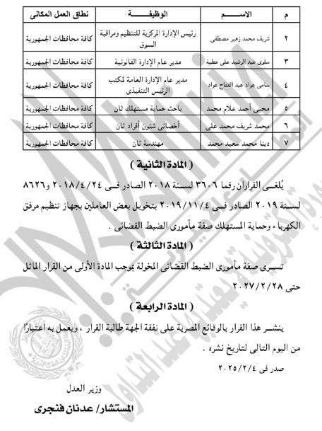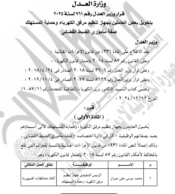 نشرت الجريدة الرسمية، اليوم الأحد، قرار المستشار عدنان فنجري، وزير العدل، بمنح الرئيس التنفيذي لجهاز تنظيم مرفق الكهرباء وحماية المستهلك، إضافة إلى ستة آخرين من العاملين بالجهاز، صفة مأموري الضبط القضائي، وذلك في دائرة اختصاصهم.