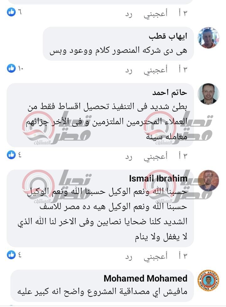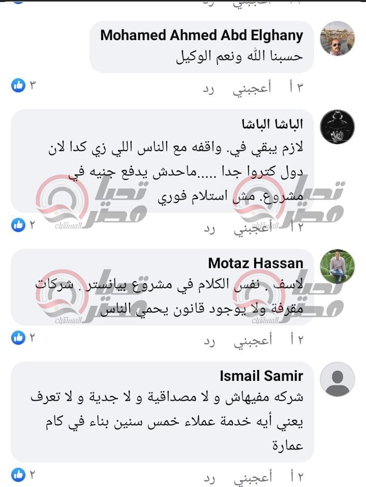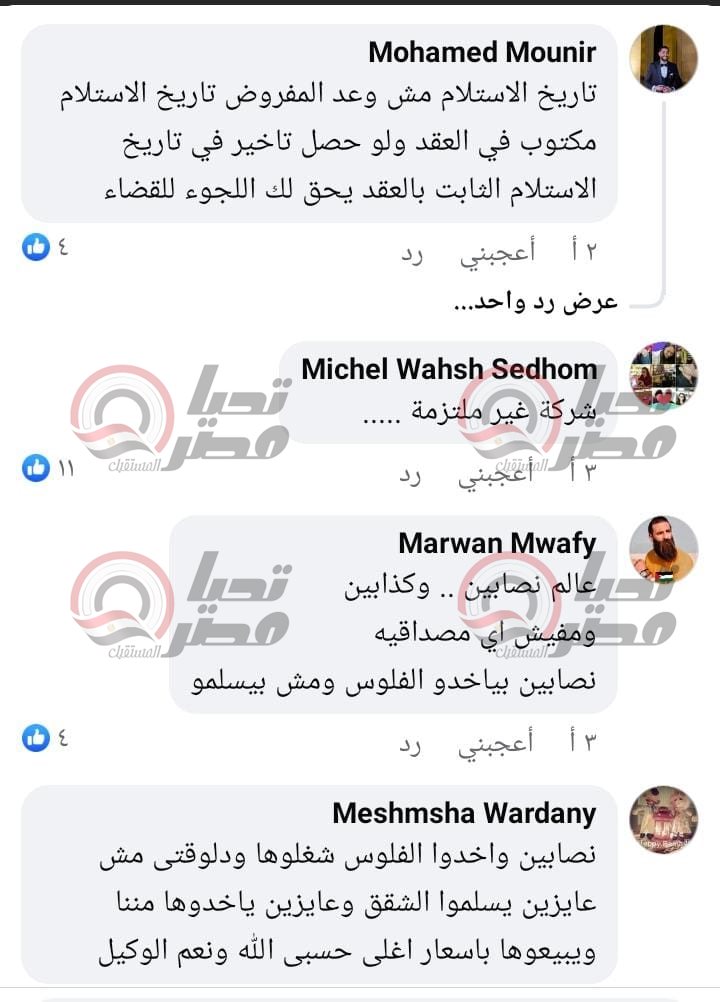 من جهته، قال أحد المتضررين: "هذه أسوأ شركة تعاملت معها ،بسبب التأخير المستمر في التسليم وسحب الشيكات قبل تسليم الشقق، بدون أي شفافية، كما أننا عندما ذهبنا إلى مقر الشركة، كان الرد أن لديهم مشاكل قانونية، وأُحضرت الشرطة أكثر من مرة لتهديدنا."