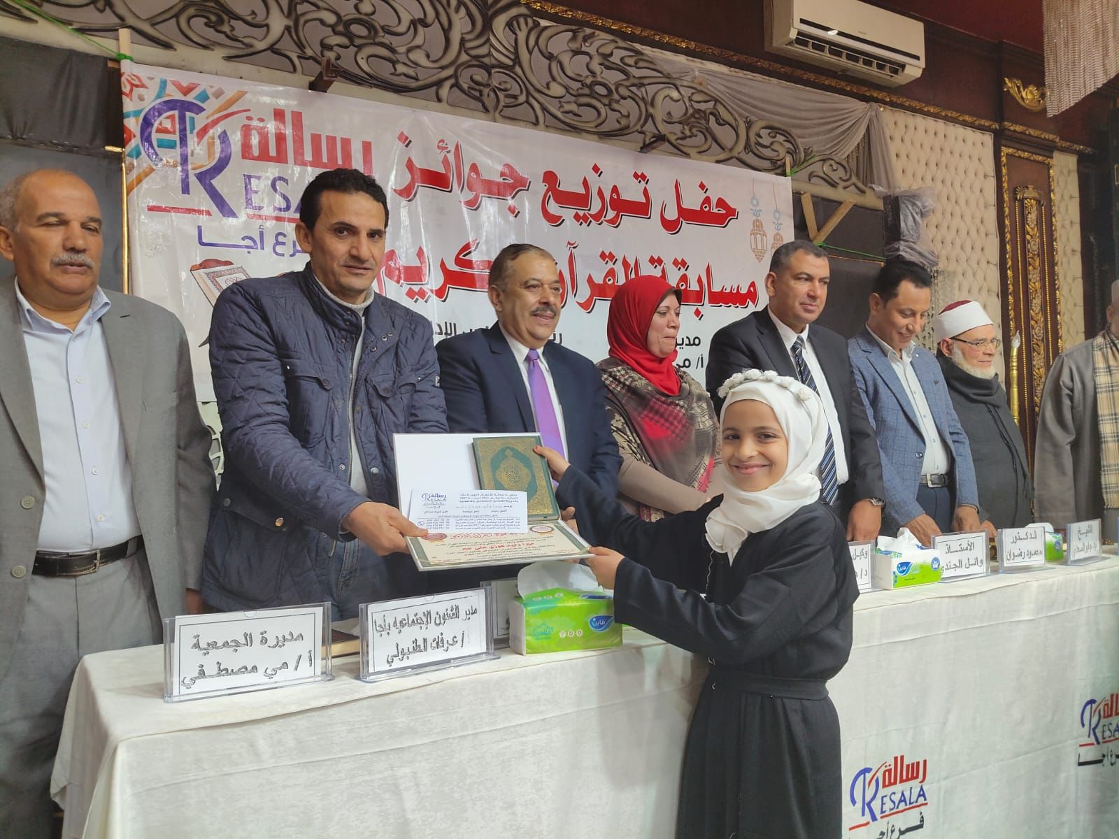 نظَّمت جمعية رسالة للأعمال الخيرية بأجا احتفالًا لتكريم حفظة القرآن الكريم على مستوي مركز اجا ، تحت رعاية اللواء طارق مرزوق محافظ الدقهلية، وبحضور الدكتورة هالة عبد الرازق جودة ،وكيل وزارة التضامن الاجتماعي بالدقهلية ، وتم توزيع الجوائز على حفظة القرآن الكريم.