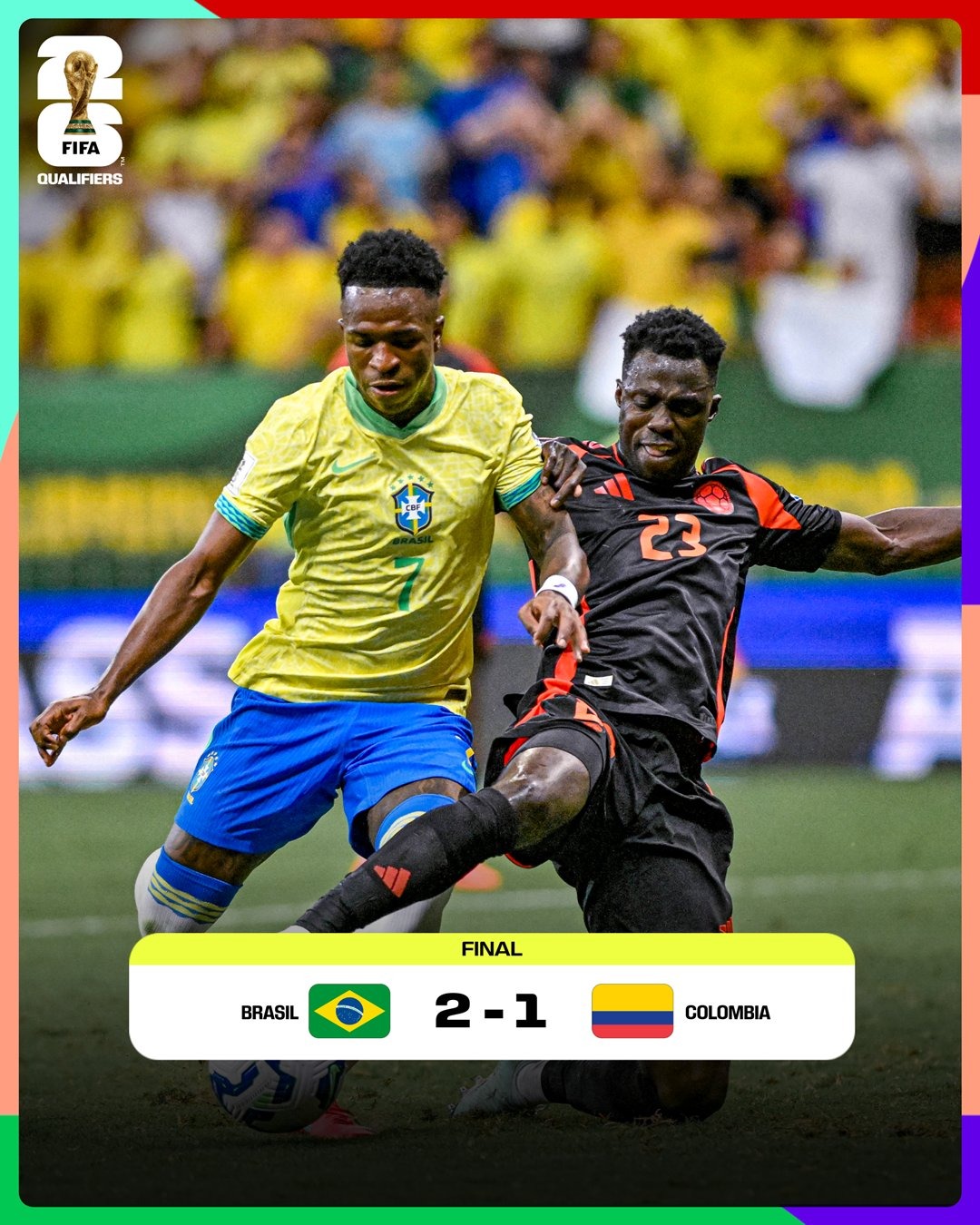 لتنتهي المباراة بفوز المنتخب البرازيلي (2-1) أمام المنتخب الكولومبي، ويرتفع رصيد المنتخب البرازيلي إلى 21 نقطة بعد تحقيق الفوز السادس، وتجمد رصيد المنتخب الكولومبي عند 19 نقطة في المركز السادس، في دور المجموعات من عمر التصفيات المؤهلة لبطولة كأس العالم 2026.