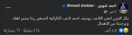 وقال أحمد شوبير في رسالة عبر فيس بوك، بكل الحزن انعي اللاعب يوسف أحمد لاعب الكاراتيه الصغير، ربنا يصبر أهله ويرحمنا من الإهمال.