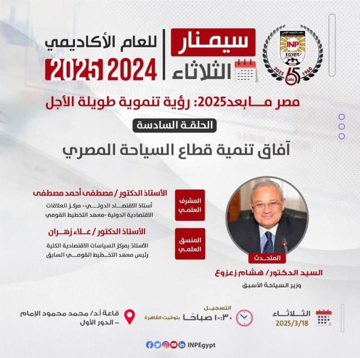 كما اكد كمال باستخلاص الدروس التي ادت الى عدم التنفيذ الكامل للبرنامج التنفيذي لرؤيه 20 30 وتنفيذ توصيات الحوار الوطني الخاصه بقطاع السياحه شارك في الندوه من حوار دكتور ابراهيم العيسوي الدكتور عدله رجب وعدد من الخبراء واساتذه الماء واساتذه المعهد ادار السيمينار دكتور علاء زهران الرئيس السابق للمعهد