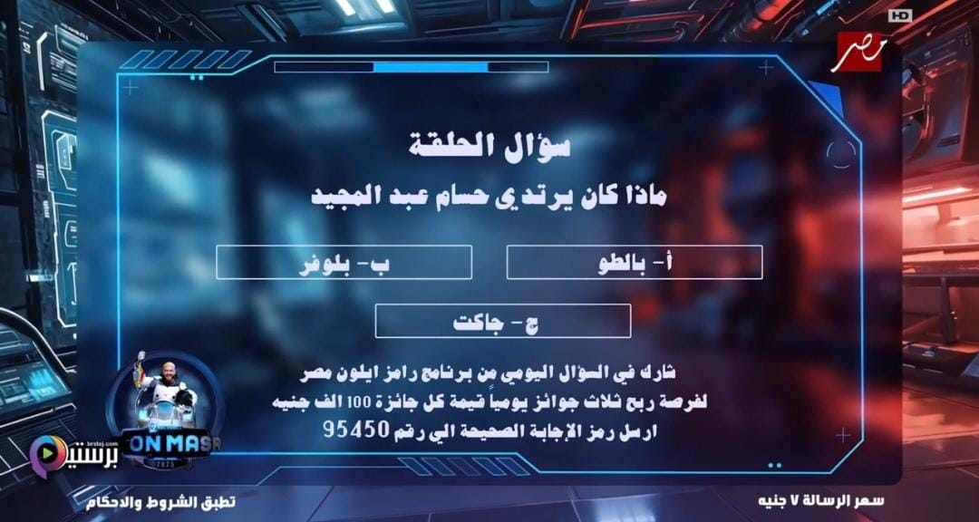 إذ كان سؤال اليوم من برنامج رامز إيلون مصر الذي يرصده موقع تحيا مصر يقول ماذا كان يرتدي حسام عبد المجيد ؟ وأعطى البرنامج الجمهور 3 اختيارات، وهم: بالطو، بلوفر، جاكيت، والجائزة تكون بقيمة 100 ألف جنيه.