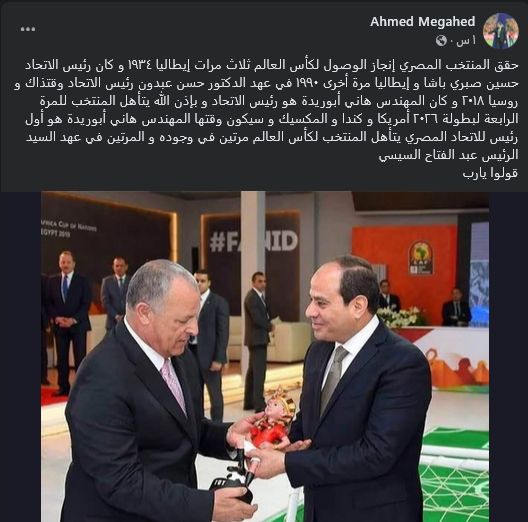 وكتب أحمد مجاهد عبر فيس بوك، حقق المنتخب المصري إنجاز الوصول لكأس العالم ثلاث مرات إيطاليا ١٩٣٤ و كان رئيس الاتحاد حسين صبري باشا وإيطاليا مرة أخرى ١٩٩٠ في عهد الدكتور حسن عبدون رئيس الاتحاد وقتذاك.